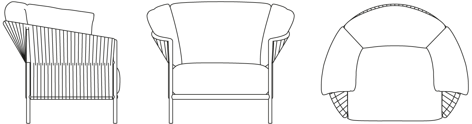 Poltrona con struttura in metallo, imbottitura idrorepellente e schienale in corda.